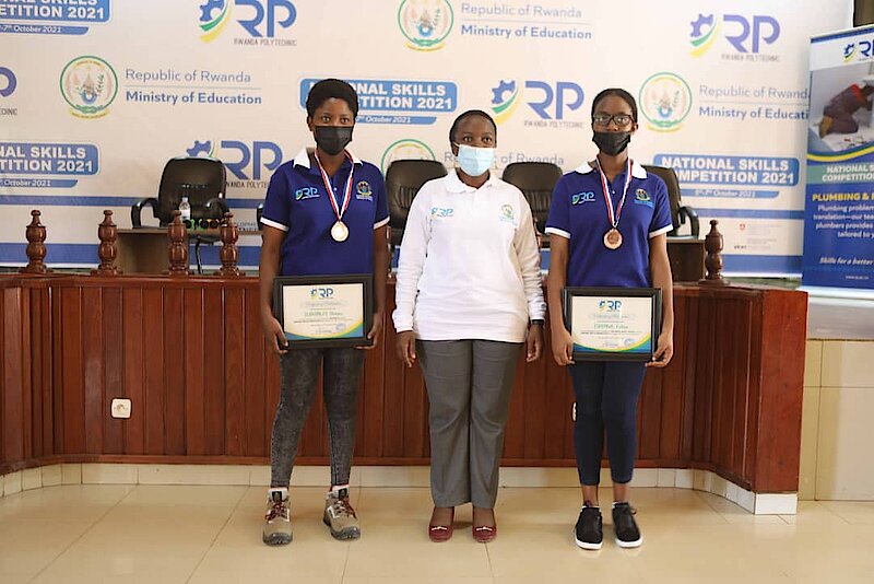 Kigali, on October 7, 2021: This Thursday, Esther Ishimwe and Denyse Igiraneza who represented IPRC Karongi won Bronze Medals and cash prizes worth 200,000 FRW each in the National Skills Competition 2021 which took place at IPRC Kigali from 5-7th October, 2021.